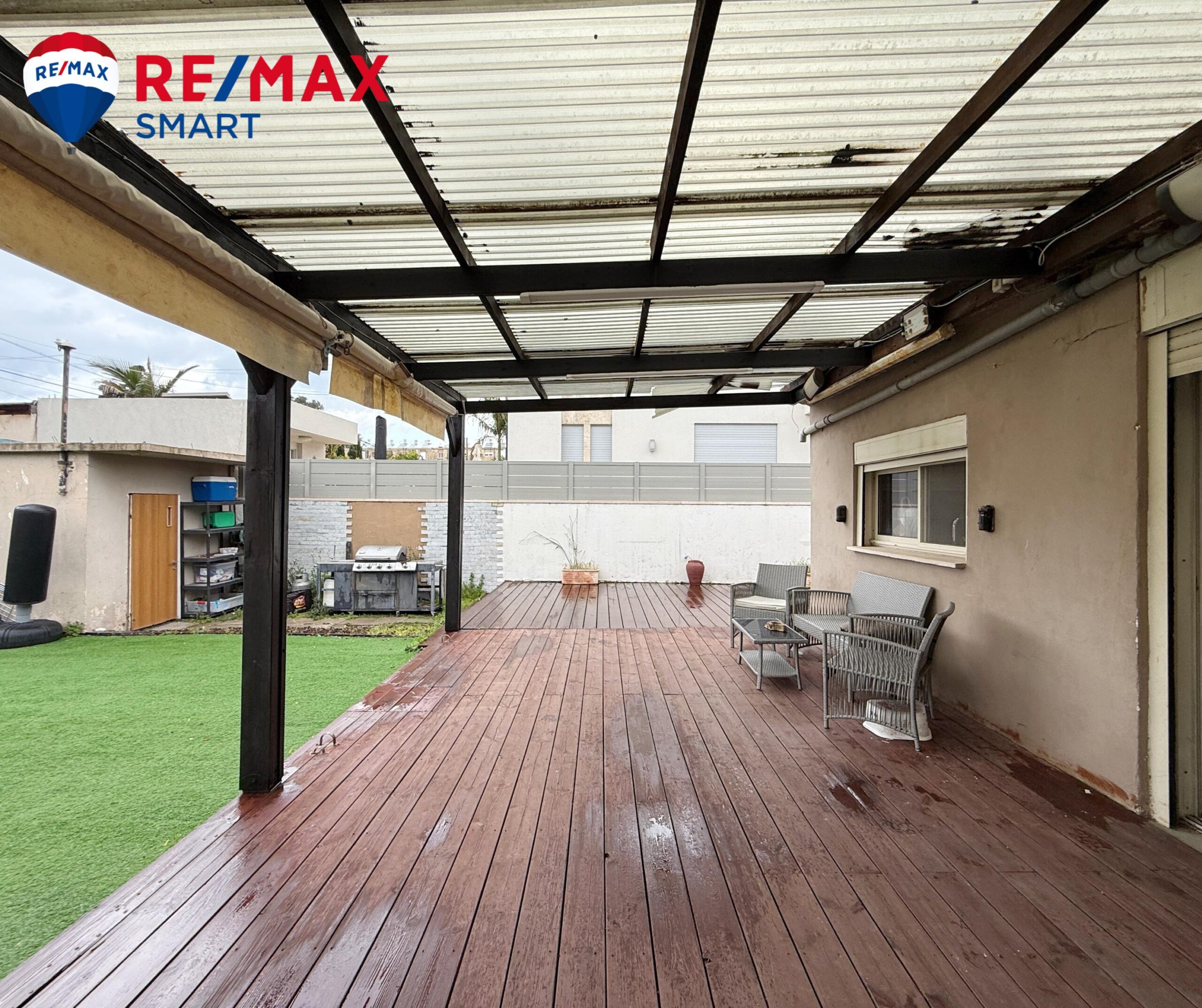 פרגולה ענקית, יציאה מהסלון עם מחסן בנוי מחוץ וגינה ענקית
